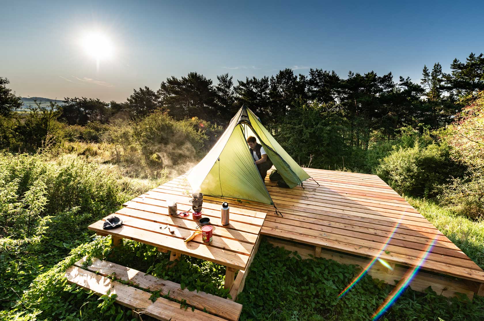Auch im Nationalpark Eifel hat man die Chance, den nächtlichen Sternenhimmel in voller Pracht zu bestaunen. Der regionale Tourismusverband bietet unter dem Motto »Nachhaltiger Astrotourismus« sogar verschiedene buchbare Tages- oder Kurzurlaubsangebote an. Übernachten kann man auf einem der wunderbaren Naturlagerplätze mit passenden Namen – beispielsweise auf dem Trekkingplatz Großer Wagen. Eine Holzplattform bietet dabei Platz für zwei Zelte und einen perfekten Blick auf den Sternenhimmel – sogar eine Komposttoilette gibt es vor Ort. Insgesamt stehen zehn solcher Trekking-Naturlagerplätze für eine einzigartige und unabhängige Wanderung zur Verfügung.