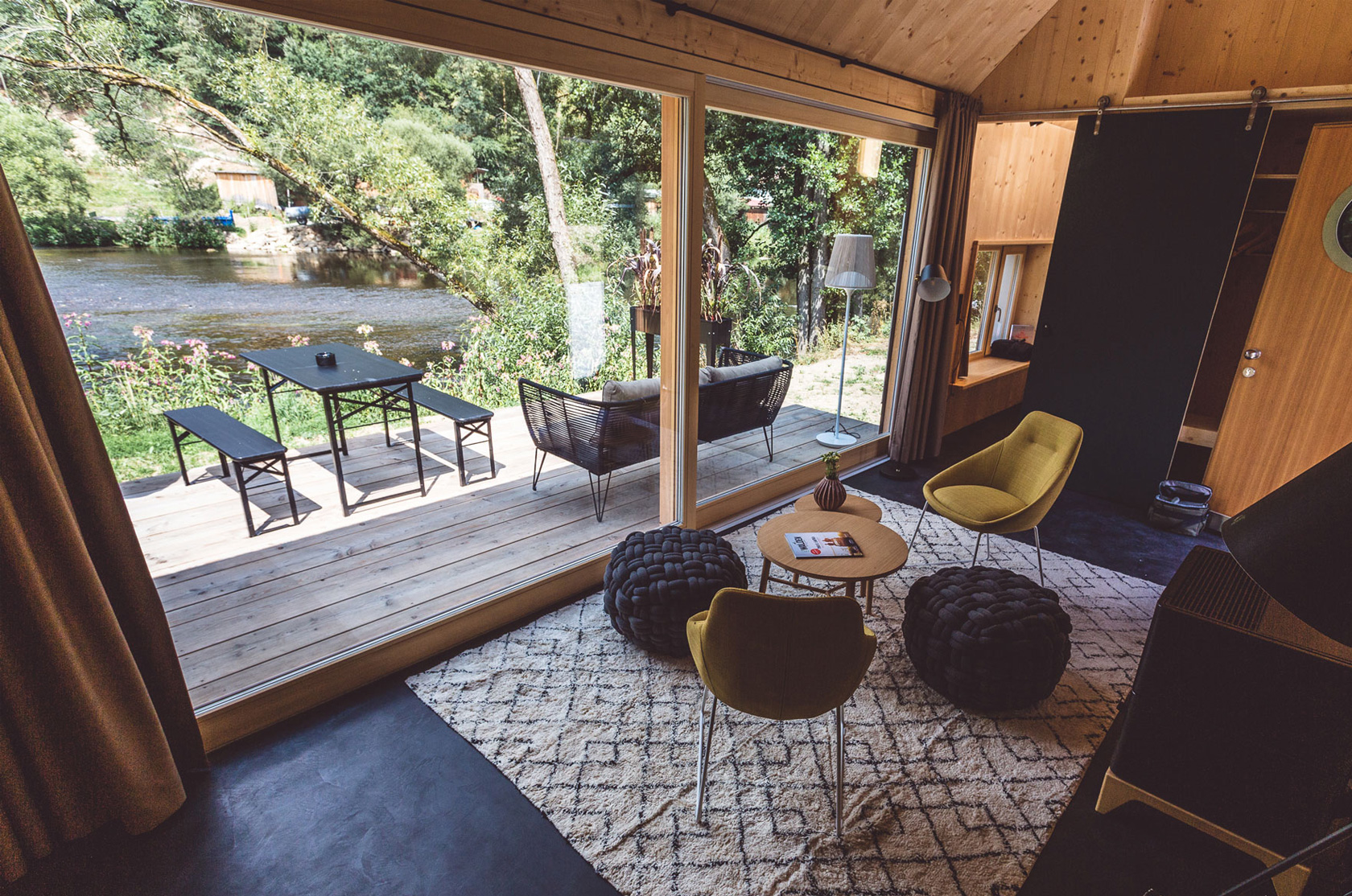 Aufsehenerregend sind daher auch die modern eingerichteten Tiny Houses der Schnitzmühle. Die fünf Häuser liegen direkt am Fluss und können bis zu vier Personen beherbergen. Hier erleben wir das »Reduce to the Max«-Prinzip in vollen Zügen: Auf nur 28 Quadratmetern wird eine Wohnqualität geboten, die in jeder Stadt seinesgleichen suchen würde. Neben den sogenannten »Schwarzen Häusern«, die durch großzügiges Panoramafenster und eigener Veranda einen tollen Ausblick bieten, gibt es noch weitere Schlafmöglichkeiten auf dem Areal. So laden auch die modern-rustikalen Zimmer im Hauptgebäude oder die offen gestalteten Lodges mit ungestörten Blick auf den Sternenhimmel zum Verweilen ein. Den Gästen in den festen Unterkünften steht dazu auch das »Emoj Spa« zur Verfügung, ein moderner Wellness-Bereich mit Sauna, Dampfbad und Whirlpool. Zelten könnt ihr natürlich auch, die »Sky Lodges« bieten auf zwei Stockwerken genügend Platz, Komfort und Abenteuer.